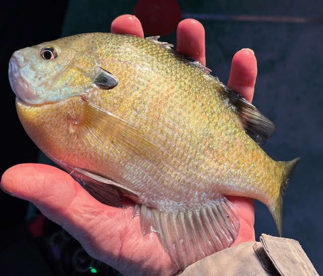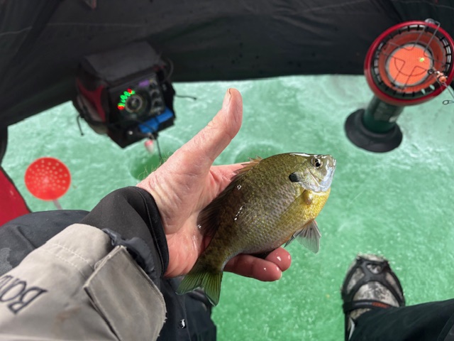 It took a week of cold weather before we made the attempt again. This time there were several groups of anglers out on the lake. Our test holes revealed at least six inches of ice. We were all good. We used our GPS to locate ourselves on a portion of the lake we knew held fish. It took a while to get our equipment properly set up, but soon I was dropping a waxworm festooned ice fishing lure through the hole. The bite started immediately. Soon we were pulling up bluegills from the gin-clear water. Many were small, but others were “keeper” sized, up to ten and a half inches. We returned most of the fish back to the lake, but I kept enough for a supper of fresh bluegills for Pam and me. Although these panfish are tedious to clean as each fish does not produce much meat, many consider bluegills one of the tastiest to eat, even superior to perch or walleye. Since that initial outing, I have made a few more trips with similar success. I eagerly await the time when the bay freezes sufficiently to allow the targeting of whitefish, perch, even walleyes. Until then, I will content myself in the humble pursuit of bluegills. I just like to catch fish.
